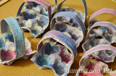 Easter is approaching and its time for craft! Time to pull out the poster paint, egg cartons, painting tarp and get messy! This year we are making Easter Baskets for relatives and friends, which we will fill with chocolate eggs and goodies. I set up a tarp over the old coffee table that I had in storage in the garage and it was the perfect height for my little one to stand at and paint. It was so fun to see how enthusiastic she became mixing colours and decorating her egg carton masterpieces!